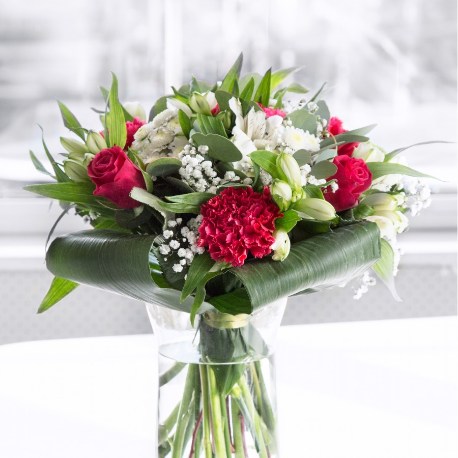 Celebrate special moments with our Timeless Elegance Bouquet. Featuring a harmonious blend of white chrysanthemums, ethereal gypsophila, and deep red roses accented by graceful carnations.